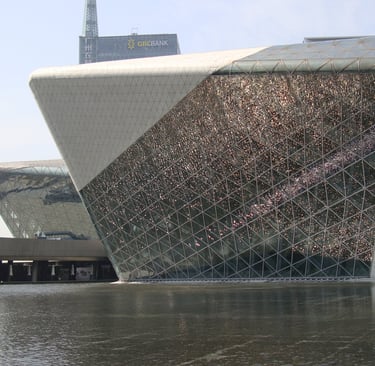 La Ópera de Cantón, diseñada por la reconocida arquitecta Zaha Hadid, es un ícono contemporáneo ubicado en Guangzhou, China. Inaugurada en 2010, su diseño se inspira en formas orgánicas que evocan piedras moldeadas por el agua, integrándose armoniosamente con el entorno urbano. El edificio destaca por su estructura fluida, uso innovador de materiales y compleja geometría. En su interior alberga espacios culturales de alto nivel, como salas de conciertos y ópera, convirtiéndose en un referente de la arquitectura deconstructivista y en un símbolo del dinamismo cultural chino.